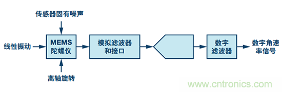 當(dāng)MEMS慣性測量單元(IMU)用作運(yùn)動(dòng)控制系統(tǒng)中的反饋傳感器時(shí),必須了解陀螺儀的噪聲情況,因?yàn)樗鼤?huì)在所監(jiān)視的平臺上造成不必要的物理運(yùn)動(dòng)。根據(jù)具體情況,針對特定MEMS IMU進(jìn)行早期應(yīng)用目標(biāo)噪聲估算時(shí)需要考慮多個(gè)潛在的誤差源。在此過程中需要考慮的三個(gè)常見陀螺儀特性為其固有噪聲、線性振動(dòng)響應(yīng)和對準(zhǔn)誤差。圖1的簡單模型顯示了會(huì)影響各誤差源評估的幾個(gè)特性:噪聲源、傳感器響應(yīng)和濾波。此模型給出了對這些特性進(jìn)行頻譜分析所需的基準(zhǔn)。