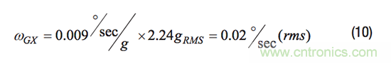 公式10通過線性加速度參數(shù)乘以ASDF (f)曲線幅值2.24 g rms,可估算產(chǎn)生的噪聲電平為0.02°/s (rms)。此噪聲電平比通過公式5得到的0.045°/s (rms)低55%,公式5的方法未采用頻譜項(xiàng)評估此噪聲源。這種改善是采用頻譜項(xiàng)定義振動(dòng)曲線以獲取值的一個(gè)示例。