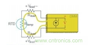 與熱敏電阻相似,鉑電阻溫度傳感器(RTD)也是用鉑制成的熱敏感電阻。當(dāng)通過(guò)測(cè)量電壓計(jì)算RTD 溫度時(shí),數(shù)字萬(wàn)用表用已知電流源測(cè)量該電流源所產(chǎn)生的電壓。這一電壓為兩條引線(Vlead)上的壓降加RTD上的電壓(Vtemp)。例如,常用RTD 的電阻為100Ω,每1℃僅產(chǎn)生0.385Ω的電阻變化。如果每條引線有10Ω電阻,就將造成26℃的測(cè)量誤差,這是不可接受的。所以應(yīng)對(duì)RTD作4線歐姆測(cè)量。
