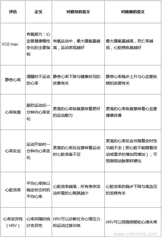 【導(dǎo)讀】在日益數(shù)字化的世界中,光學(xué)心率傳感器在可穿戴設(shè)備中的應(yīng)用越來(lái)越廣泛。這些設(shè)備中數(shù)不清的應(yīng)用可提供從個(gè)人活動(dòng)、健身水平到健康狀況的所有內(nèi)容。精準(zhǔn)的生物識(shí)別傳感器數(shù)據(jù)可以提供準(zhǔn)確的健身/健康評(píng)估,但設(shè)計(jì)師和工程師究竟能用這些評(píng)估做些什么呢?表1總結(jié)了目前在健身應(yīng)用中使用的一些常見(jiàn)評(píng)估,這些評(píng)估也證明了健康醫(yī)療的意義。