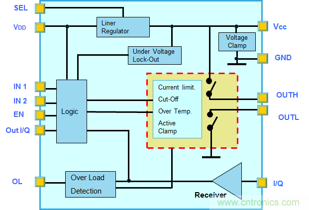 該產(chǎn)品有自我保護(hù)功能:截止限流(不耗散短路保護(hù))、過熱關(guān)斷、主動(dòng)電壓鉗位、右側(cè)引腳極性接返保護(hù)、欠壓鎖保護(hù)和EN60947-5-2和IEC61000-4-5標(biāo)準(zhǔn)電涌保護(hù)。所謂的不耗散短路保護(hù)是一項(xiàng)創(chuàng)新的電路專利技術(shù),當(dāng)輸出級(jí)對(duì)地短路時(shí)可最大限度降低耗散功率;在多數(shù)情況下可避免過熱關(guān)斷干預(yù)。