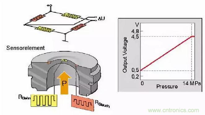 的惠斯頓電橋,膜片的變形導(dǎo)致應(yīng)變計(jì)電阻變化,通過外圍電路的的信號(hào)處理后,形成與壓力成線