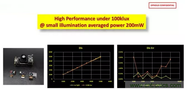 炬佑智能在ToF感知功能方面做了大量的開發(fā),劉洋先生在現(xiàn)場為大家展示了炬佑智能開發(fā)的3D ToF傳感芯片和模組的測試結果。經(jīng)過炬佑智能自己研發(fā)的智能算法校正后,ToF傳感器在不同背景光的反射率誤差從6%下降到1.4%以下;通過傳感器融合,940nm ToF傳感器在室外的探測精度達到5‰以下;在室外強光環(huán)境下,通過動態(tài)算法的提升,在100klux、照明平均功耗在200mW的水平下,3D ToF傳感模組表現(xiàn)出非常優(yōu)秀的性能。