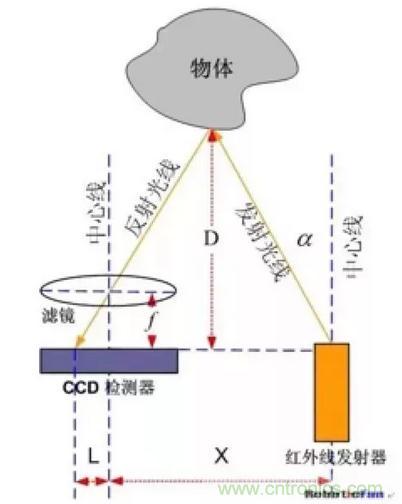 一般的紅外測(cè)距都是采用三角測(cè)距的原理。紅外發(fā)射器按照一定角度發(fā)射紅外光束,遇到物體之后,光會(huì)反向回來(lái),檢測(cè)到反射光之后,通過(guò)結(jié)構(gòu)上的幾何三角關(guān)系,就可以計(jì)算出物體距離D。
