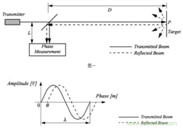 比較簡(jiǎn)單的方案是測(cè)量反射光的相移,傳感器以已知的頻率發(fā)射一定幅度的調(diào)制光,并測(cè)量發(fā)射和反向信號(hào)之間的相移,如上圖一。調(diào)制信號(hào)的波長(zhǎng)為lamda=c/f,其中c是光速,f是調(diào)制頻率,測(cè)量到發(fā)射和反射光束之間的相移差theta之后,距離可由lamda*theta/4pi計(jì)算得到,如上圖二。