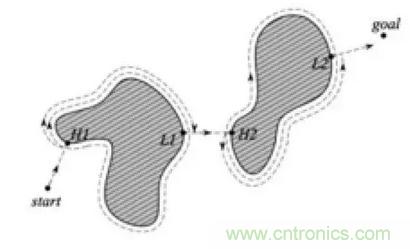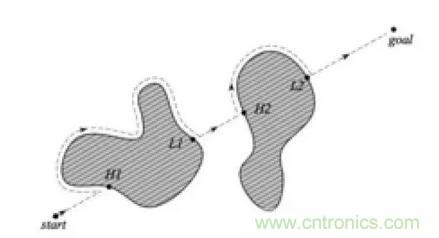改進(jìn)后的Bug2算法中,機(jī)器人開(kāi)始時(shí)會(huì)跟蹤物體的輪廓,但不會(huì)完全圍繞物體一圈,當(dāng)機(jī)器人可以直接移動(dòng)至目標(biāo)時(shí),就可以直接從障礙分離,這樣可以達(dá)到比較短的機(jī)器人行走總路徑。