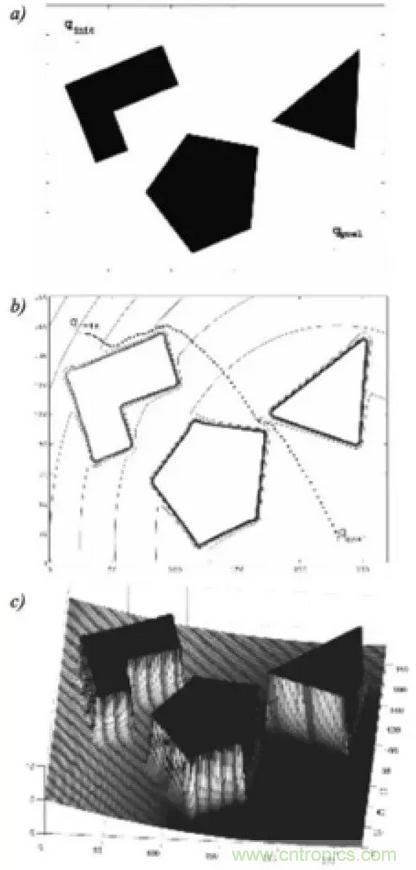 上面這個(gè)圖是勢(shì)場(chǎng)比較典型的示例圖,最上的圖a左上角是出發(fā)點(diǎn),右下角是目標(biāo)點(diǎn),中間三個(gè)方塊是障礙物。中間的圖b就是等勢(shì)位圖,圖中的每條連續(xù)的線就代表了一個(gè)等勢(shì)位的一條線,然后虛線表示的在整個(gè)勢(shì)場(chǎng)里面所規(guī)劃出來(lái)的一條路徑,我們的機(jī)器人是沿著勢(shì)場(chǎng)所指向的那個(gè)方向一直行走,可以看見(jiàn)它會(huì)繞過(guò)這個(gè)比較高的障礙物。