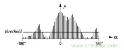 它執(zhí)行過(guò)程中針對(duì)移動(dòng)機(jī)器人當(dāng)前周邊環(huán)境創(chuàng)建了一個(gè)基于極坐標(biāo)表示的局部地圖,這個(gè)局部使用柵格圖的表示方法,會(huì)被最近的一些傳感器數(shù)據(jù)所更新。VFH算法產(chǎn)生的極坐標(biāo)直方圖如圖所示: