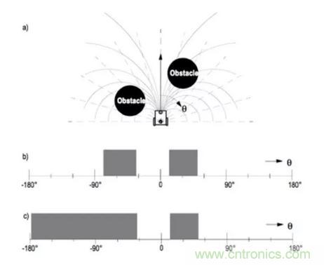 圖中x軸是以機(jī)器人為中心感知到的障礙物的角度,y軸表示在該方向存在障礙物的概率大小p。實(shí)際應(yīng)用的過(guò)程中會(huì)根據(jù)這個(gè)直方圖首先辨識(shí)出允許機(jī)器人通過(guò)的足夠大的所有空隙,然后對(duì)所有這些空隙計(jì)算其代價(jià)函數(shù),最終選擇具有最低代價(jià)函數(shù)的通路通過(guò)。