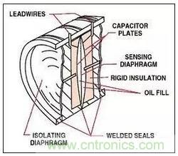 差動(dòng)電容式壓力傳感器的受壓膜片電極位于兩個(gè)固定電極之間,構(gòu)成兩個(gè)電容器。在壓力的作用下一個(gè)電容器的容量增大而另一個(gè)則相應(yīng)減小,測量結(jié)果由差動(dòng)式電路輸出。它的固定電極是在凹曲的玻璃表面上鍍金屬層而制成。過載時(shí)膜片受到凹面的保護(hù)而不致破裂。差動(dòng)電容式壓力傳感器比單電容式的靈敏度高、線性度好,但加工較困難(特別是難以保證對稱性),而且不能實(shí)現(xiàn)對被測氣體或液體的隔離,因此不宜于工作在有腐蝕性或雜質(zhì)的流體中。