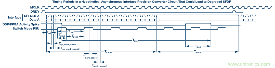 在圖15中,標(biāo)記了各種定時周期,這很容易干擾SFDR或?qū)е露秳印H绻鸖PI通信未頻鎖到MCLK,則可能發(fā)生雜散。掌握布局技術(shù)是您緩解此問題的最大保障。頻率表現(xiàn)為混疊下行干擾源,但也作為拍頻和交調(diào)產(chǎn)物。例如,如果SPI在16.01 MHz下運行,MCLK在16 MHz下運行,則應(yīng)在10 kHz下發(fā)生雜散。