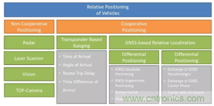 用于車輛相對定位的測距傳感器和技術(shù)可以概括為下圖,首先分為兩大類:非協(xié)作式定位和協(xié)作式定位。非協(xié)作式定位包括:雷達(dá)、激光掃描儀、視覺和TOF攝像機(jī);協(xié)作式定位包括:基于轉(zhuǎn)發(fā)器的測距(根據(jù)射頻信號直接估算相對距離)和基于GNSS的相對定位(通過通訊的方式傳遞GNSS測得的位置相關(guān)信息,包括GNSS解算得到的位置和原始的GNSS信息,如偽距)。具體對各個(gè)定位技術(shù)的介紹請參見原文,限于篇幅,本譯文只進(jìn)行部分翻譯,著重于定位需求的分析以及對各個(gè)定位技術(shù)的評價(jià)。