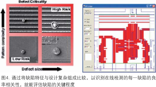 為了提高監(jiān)測(cè)和識(shí)別關(guān)鍵缺陷的效率,必須采用新方法。依賴簡單的缺陷過濾和基于大小的缺陷次序是不夠的。為了取得最佳的檢測(cè)和鑒評(píng)預(yù)算,必須對(duì)檢測(cè)設(shè)置與鑒評(píng)策略二者使用新的知識(shí)信息。從設(shè)計(jì)和模擬得到的關(guān)鍵區(qū)域和熱點(diǎn)這樣一些知識(shí)信息可以插入檢測(cè)方略中,優(yōu)化可用的檢測(cè)容量。在完成檢測(cè)過程中和完成后,基于多重檢測(cè)結(jié)果的缺陷過濾和分類使用戶能快速識(shí)別新缺陷,有效地量化已知的缺陷類型。利用設(shè)計(jì)空間中缺陷鄰近位置的信息(此處,設(shè)計(jì)的復(fù)雜組成是了解的),可以較好地評(píng)估每一缺陷的良率相關(guān)性,提供缺陷的排序(圖4)。