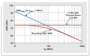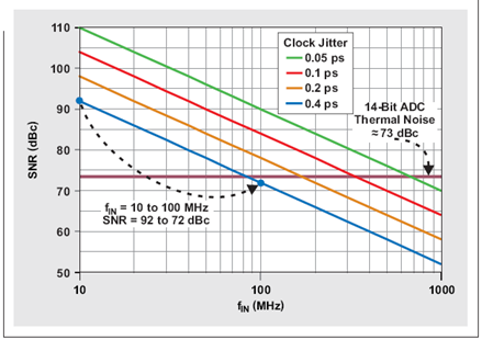正如我們預(yù)計的那樣,利用固定數(shù)量的時鐘抖動,SNR 隨輸入頻率上升而下降。圖 4 描述了這種現(xiàn)象,其顯示了 400 fs 固定時鐘抖動時一個 14 位管線式轉(zhuǎn)換器的 SNR。如果輸入頻率增加十倍,例如:從 10MHz 增加到 100MHz,則時鐘抖動帶來的最大實際 SNR 降低 20dB。